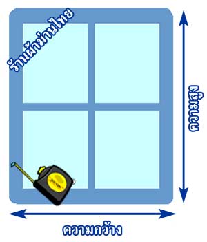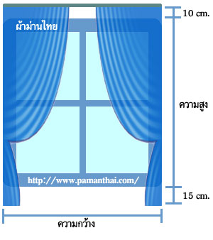 - การวัดขนาดสำหรับม่านจีบ โดยปกติจะบวกเพิ่มจากขอบวงกบด้านบนอีก 10 ซม. และบวกเพิ่มจากขอบวงกบด้านล่างอีก 15 - 20 ซม. หรือตามต้องการ